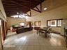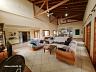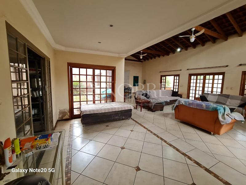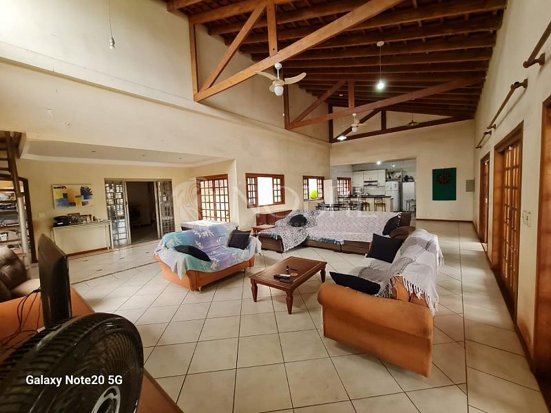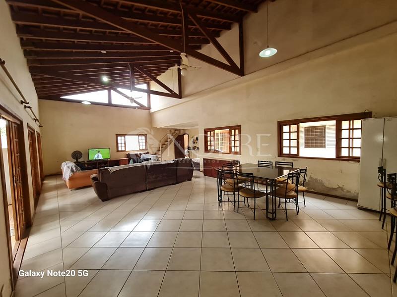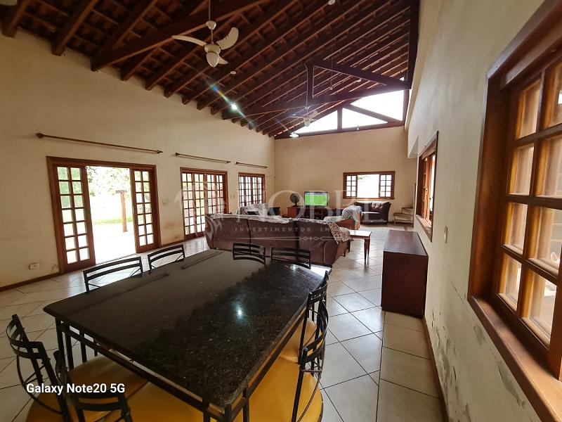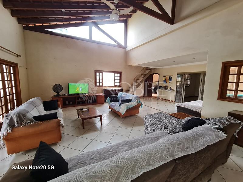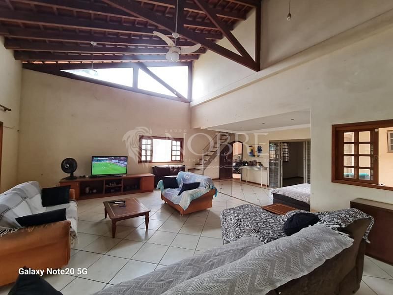 - Sala com três ambientes, com cerca de 115 m² e pé direito alto